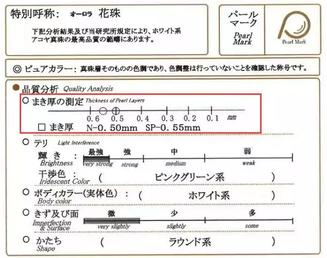 另外,日本真研所、珍珠输出加工协同组合出具的证书,都会标注珠层厚度: