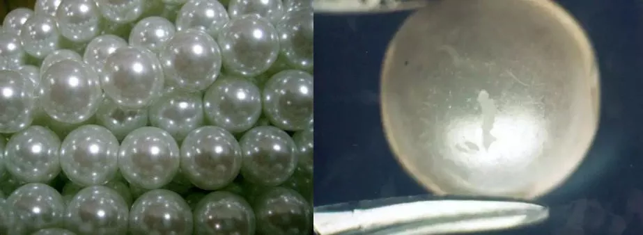 这类造假方式,比塑料珍珠亮度好,但是外表这层珠光漆则十分脆弱,珠子们相互摩擦就会漏出里面的玻璃~